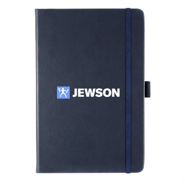 Navy Blue A5 Ultimate Notebook with a soft touch cover. 80 cream lined pages with rounded corners, a colour matched elastic strap closure, pen loop and ribbon marker.