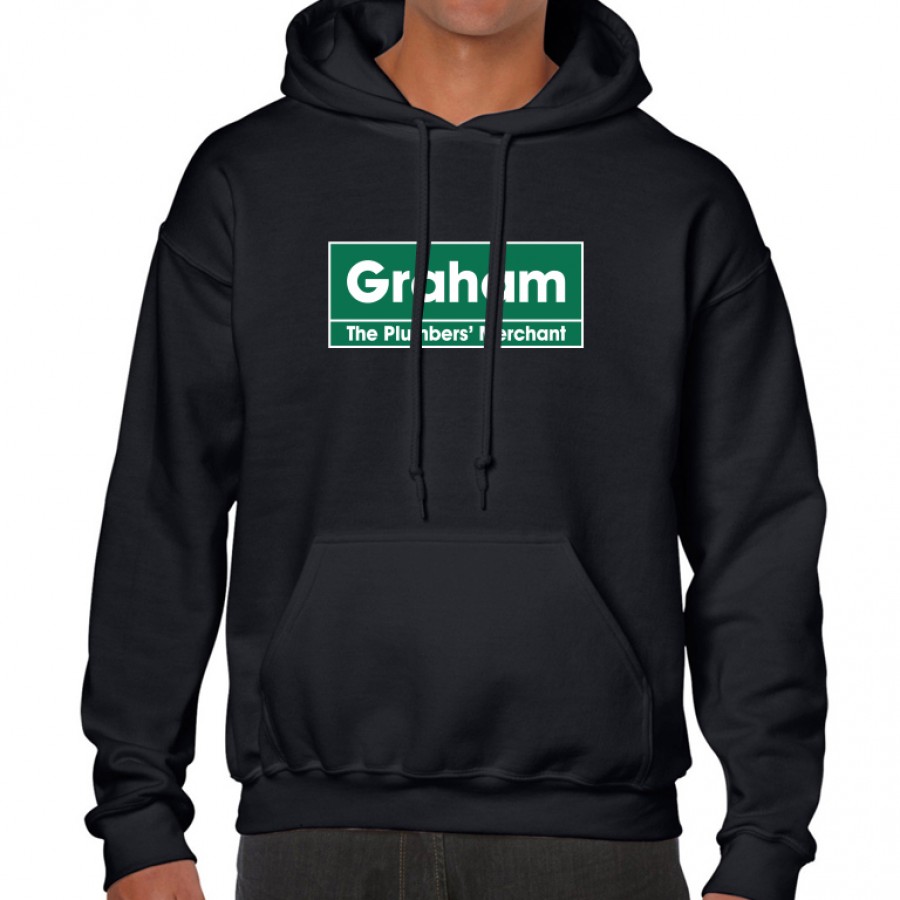 Black Hooded Sweatshirt, with kangaroo pocket and drawstring. Printed two colours to the front with Graham logo.