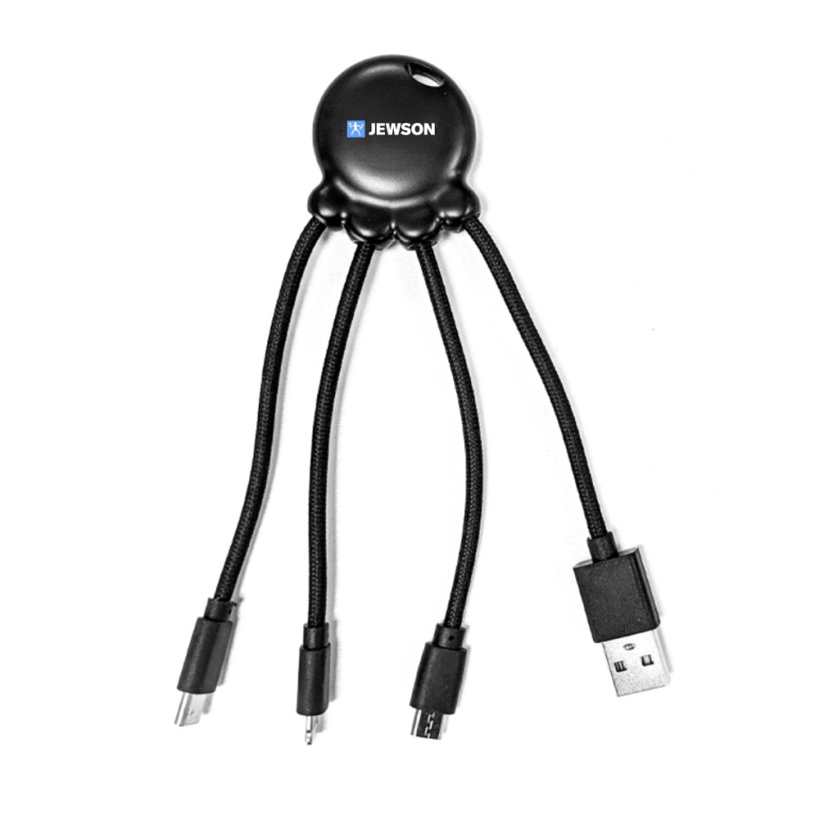 Multi cable features 4 common charging cable connectors designed to fit most mobile phones for charging. USB Type-C, Lightning connector for Iphones, Micro USB connector (for Android and Windows phones) and also the main USB charging connector.Biodegradable case & adapter housing with RPET cable.